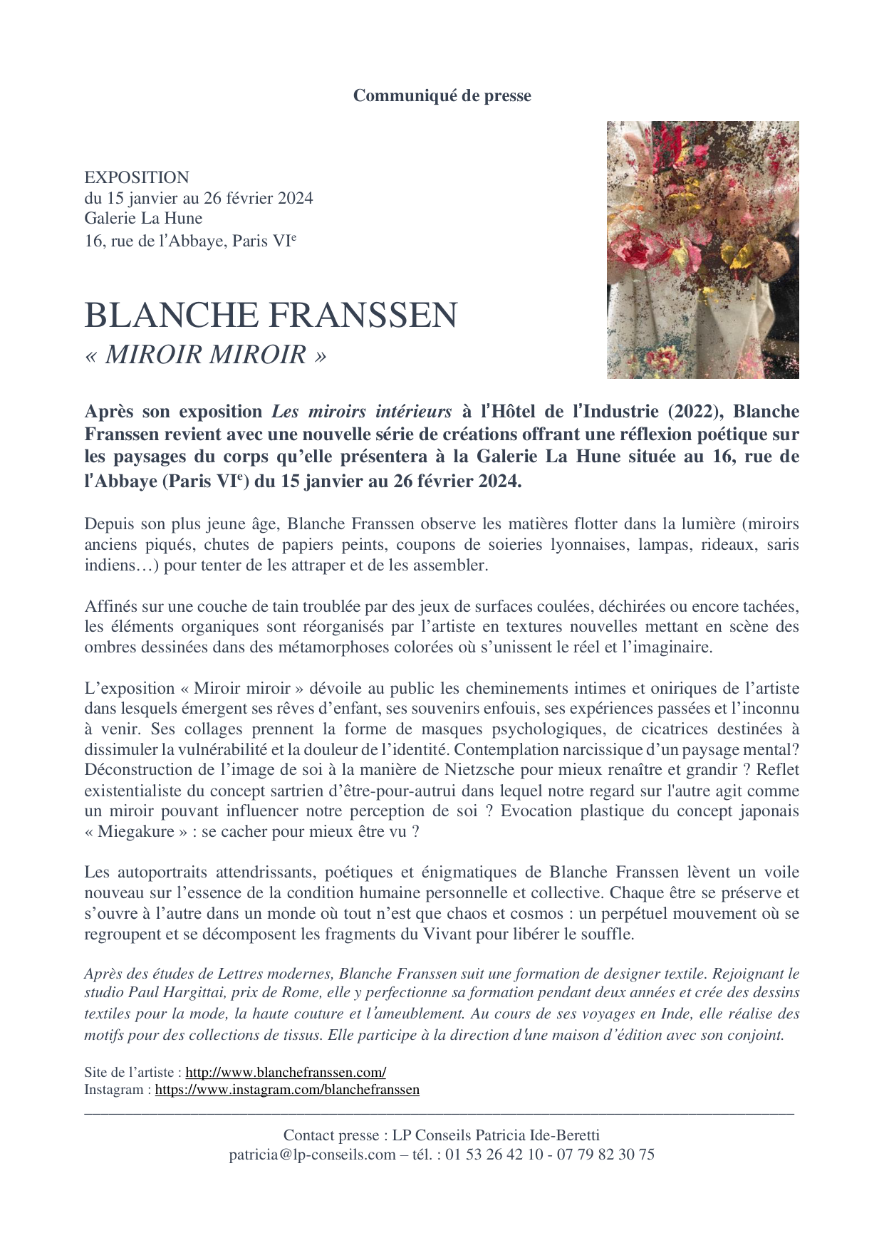 « Blanche Franssen réinvente, réorganise pour créer des textures nouvelles qui sont à la fois support et œuvres dont beaucoup, posées et travaillées sur des miroirs dont elle affine le grain de tain, saisissent le visiteur par sa puissance d’évocation et sa féérie aussi . L’effet produit, associé souvent à un travail photographique personnel comme le montre l’affiche de présentation de l’exposition, est unique. Une bonne raison -mais en faut -il une ? - pour accéder de plain-pied dans cet univers où l’onirique supplante la réalité... »